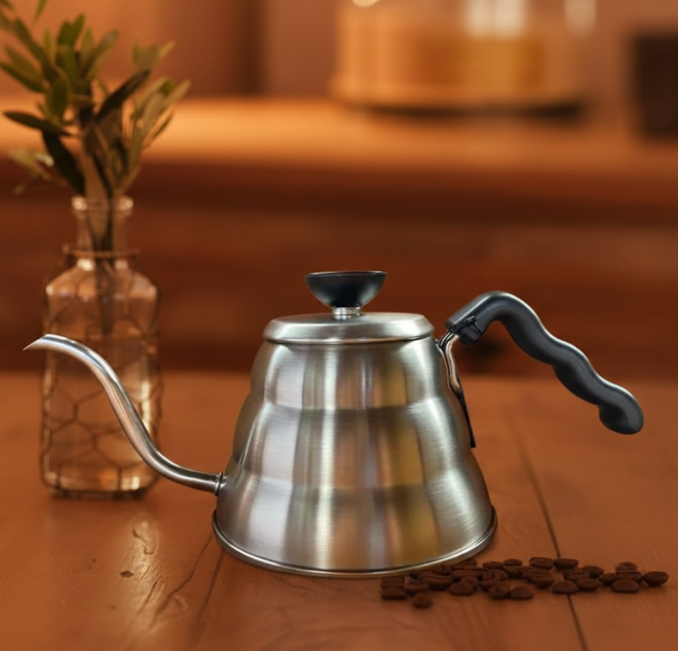 A chaleira em aço inox foi projetada para extrair o melhor dos cafés especiais no método coado. Seu bico fino permite controlar o fluxo contínuo da água quente e seu formato de colméia conserva a temperatura da água por mais tempo.