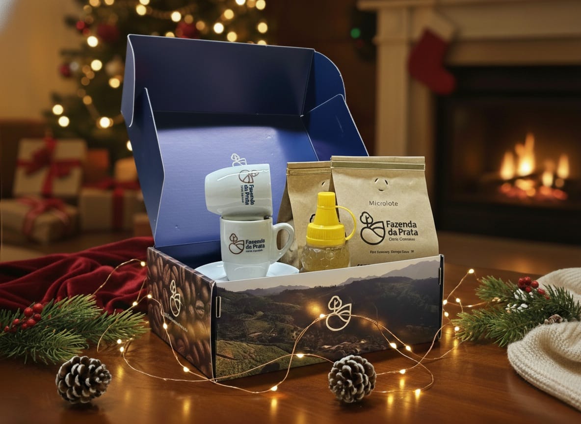 O coração deste kit são os dois cafés da linha Seleções da Fazenda avaliados com a impressionante pontuação de 89.70 (BCSA). Prepare-se para um perfil de sabor que evoca o espírito natalino: Floral, Frutas Amarelas e Pêssego em Calda, com a doçura do Mel e Rapadura. Sua acidez cítrica e finalização longa prometem uma bebida complexa e inesquecível.